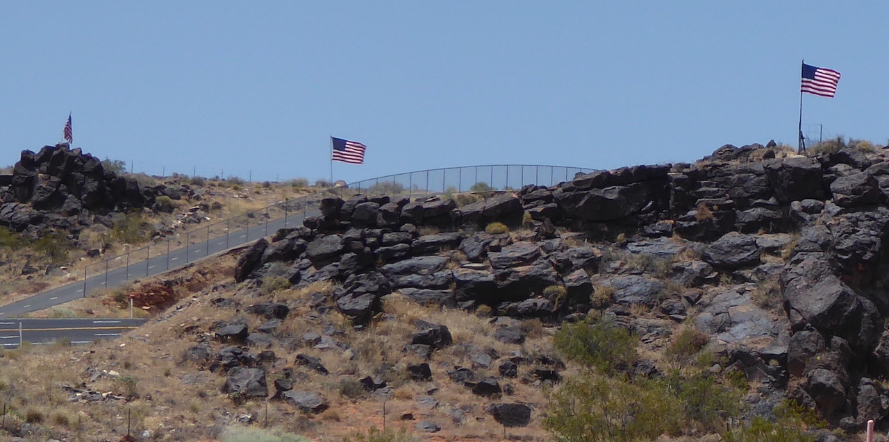 A number of extinct volcanos border SR-18, forming the Santa Clara volcanic field and lava flow. The Santa Clara Cinder Cone is right along SR-18 as seen in the photo. It is located between Diamond Valley and Snow Canyon State Park (seen behind the cinder cone). The Trailhead is along SR-18 and leads up to the crater.