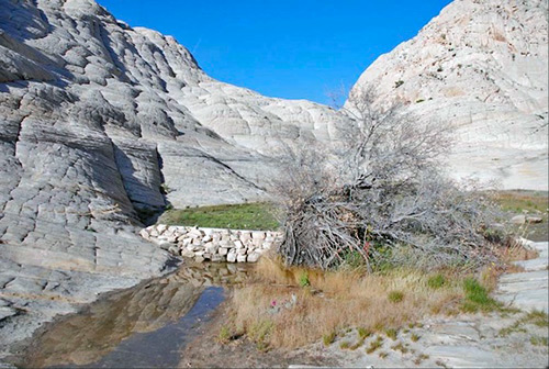 This trailhead is adjacent to SR-18 and a short hike leads into calcium impregnated rocks giving them a white color, and forming an amphitheater.